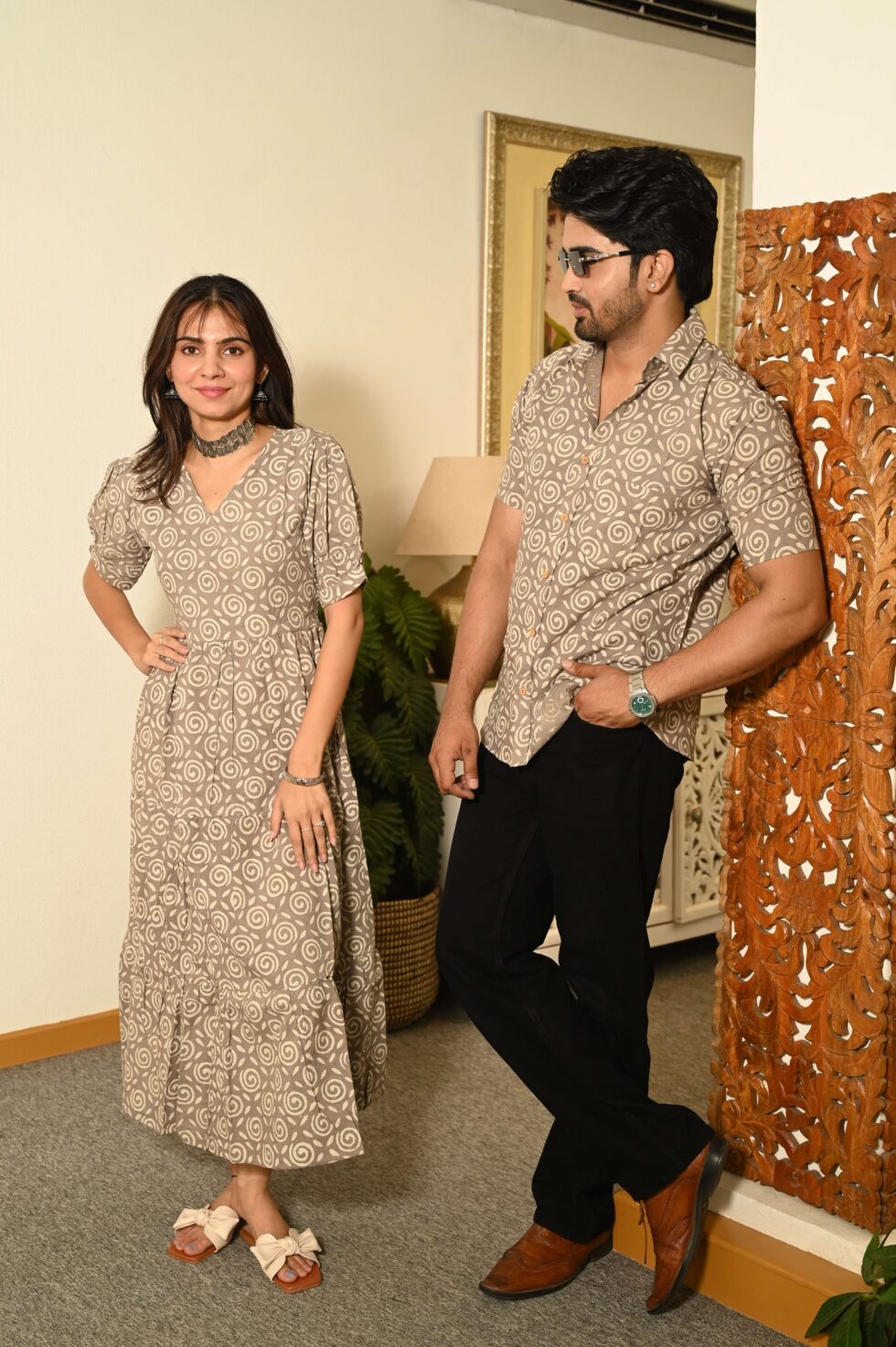 A sophisticated beige cotton outfit set with artistic swirl block prints. The flowy V-neck dress complements the casual short-sleeve shirt, making it a classy choice for outings and gatherings.